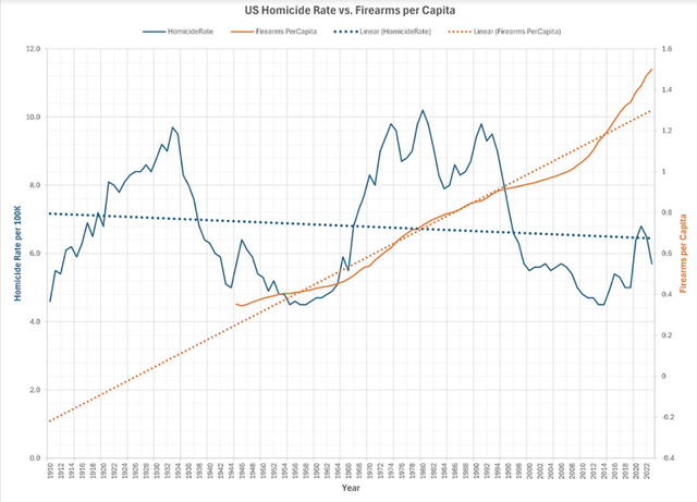 Long-term data to test the premise is available. There is FBI data on homicide rates in the United States going back to 1910. Homicides are the most reliable crime figure because there is a body and an investigation. There is fairly good data on the number of firearms that are privately owned in the United States. If more guns equals more crime, an increase in per capita firearms ownership should be correlated with the homicide rate.